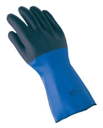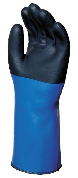 This is a double-layer glove, with thermal insulation and extended length for extra arm protection. It offers multi-purpose chemical resistance (acids, aliphatic solvents) that is increased by the thickness of the material. It has excellent thermal insulation, due to double-knit cotton and gets a good grip of wet or slippery objects.