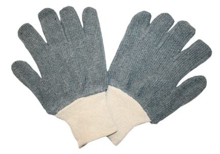 Loop-out cotton terry gloves are primarily used in light heat applications. Loop-out terry lets air pass through, cooling down the cotton, which a good heat-absorbing material. These 24-ounce terry gloves feature a natural-color knit wrist and gray glove.