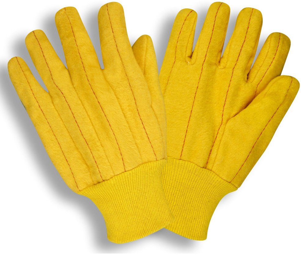 This quilted, yellow chore glove features a yellow knit wrist. Cotton chore gloves are heavier than cotton jerseys and handle abrasion similar to a canvas glove. Chores are heavily napped (made fuzzy) for warmth and are used in farming, agriculture, and some material handling where temperatures are cooler.