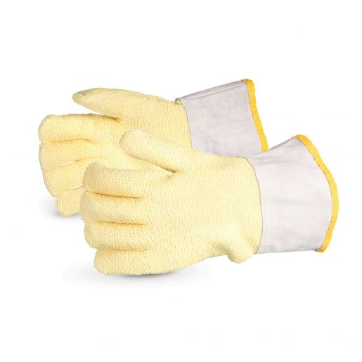 This glove features a 100% Kevlar® outer shell, a 100% cotton terry liner, leather lined front and back and a 4" leather gauntlet cuff. It offers heat protection of up to 608°F (320°C).