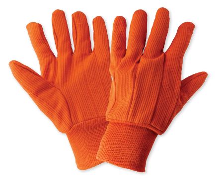 These 18 oz. corded, 100% cotton gloves are orange and feature a matching knit wrist cuff and a straight thumb. These gloves are an excellent choice for applications that require hand visibility for safety.