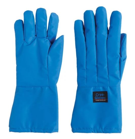 Cryogenic gloves with a water-resistant coating that repels liquid splashes when working with ultra-cold materials at temperatures down to -196°C (-320°F)