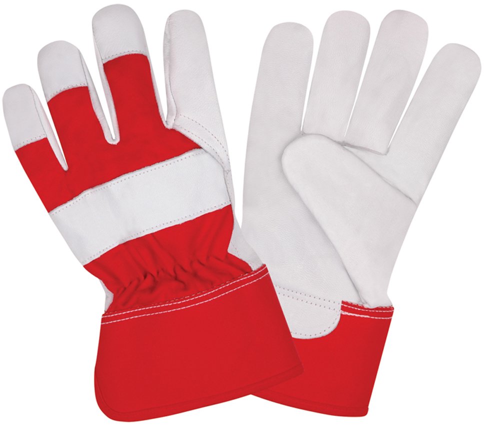 This grain leather, goatskin palm from Cordova Safety Products features a red canvas back, gunn cut pattern, and rubberized safety cuff.