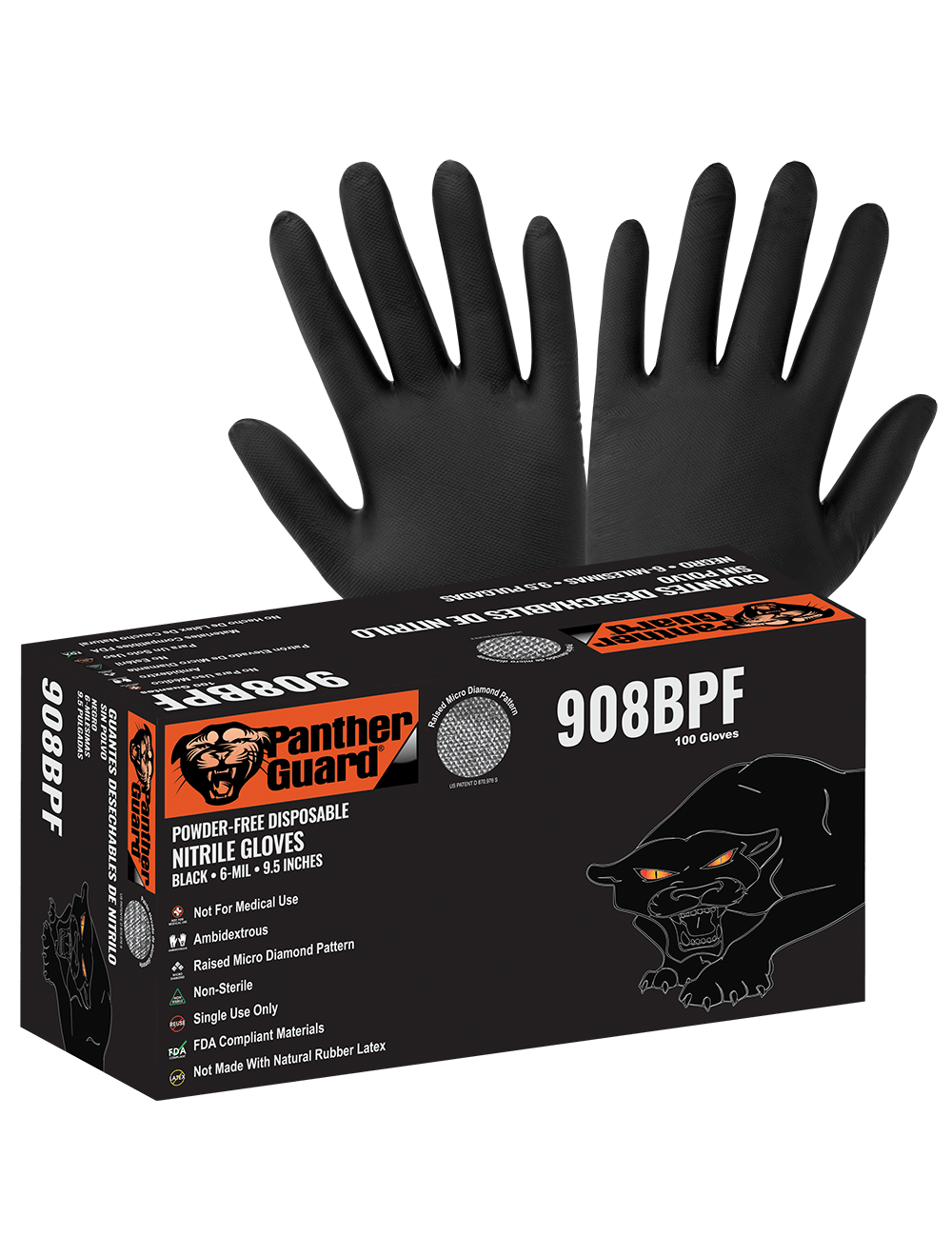 The Global Glove Panther-Guard black 6-mil disposable gloves are made from 100% nitrile. They feature a rolled/beaded cuff and a unique ambidextrous raised micro-diamond pattern. They comply with FDA regulations for food contact, come packaged 100 gloves to a dispenser box, and 10 dispenser boxes per case.