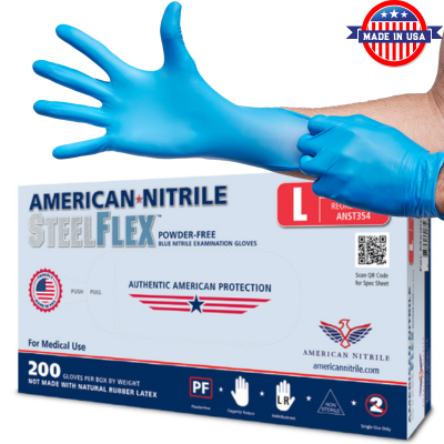 The American Nitrile Steel Flex Nitrile gloves feature an uncompromising medical grade quality with a barrier to protect patients and practitioners. American Nitrile Gloves are proudly manufactured in their Grove City, Ohio facility and are 100% Made in the USA.