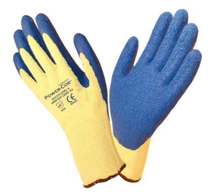 High-performance polyethylene gloves with added steel and/or Kevlar® /Aramid fiber offer an increased cut resistance over gloves made with HPPE only. Kevlar® is a strong, synthetic yarn that offers extra strength & protection and high-temperature resistance. The Cordova Power-Cor™ glove is constructed of 100% Kevlar®. It features a blue, crinkle finish latex palm and an A3 cut level and ANSI Abrasion Level 3.