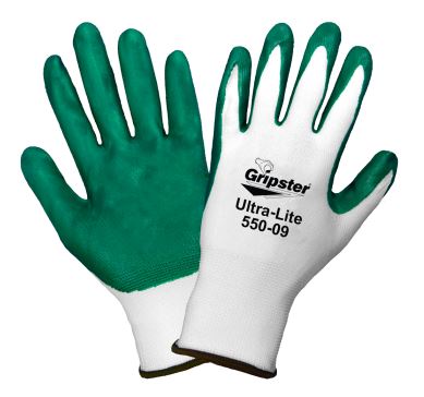 Gripster® are ultra-lite gloves that are constructed from 13-gauge nylon and have a knit cuff or comfort. They feature a solid green nitrile palm dip for an excellent dry grip.