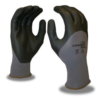 Machine knit, nitrile-coated gloves are incredibly durable and offer excellent sense of touch. Foam nitrile coatings are porous, which channels oil away from the glove surface for a secure grip in light oil applications. This Cordova Conquest Xtra™ glove features a 15-gauge, gray, nylon/spandex shell and black, foam nitrile/polyurethane ¾-palm coating.