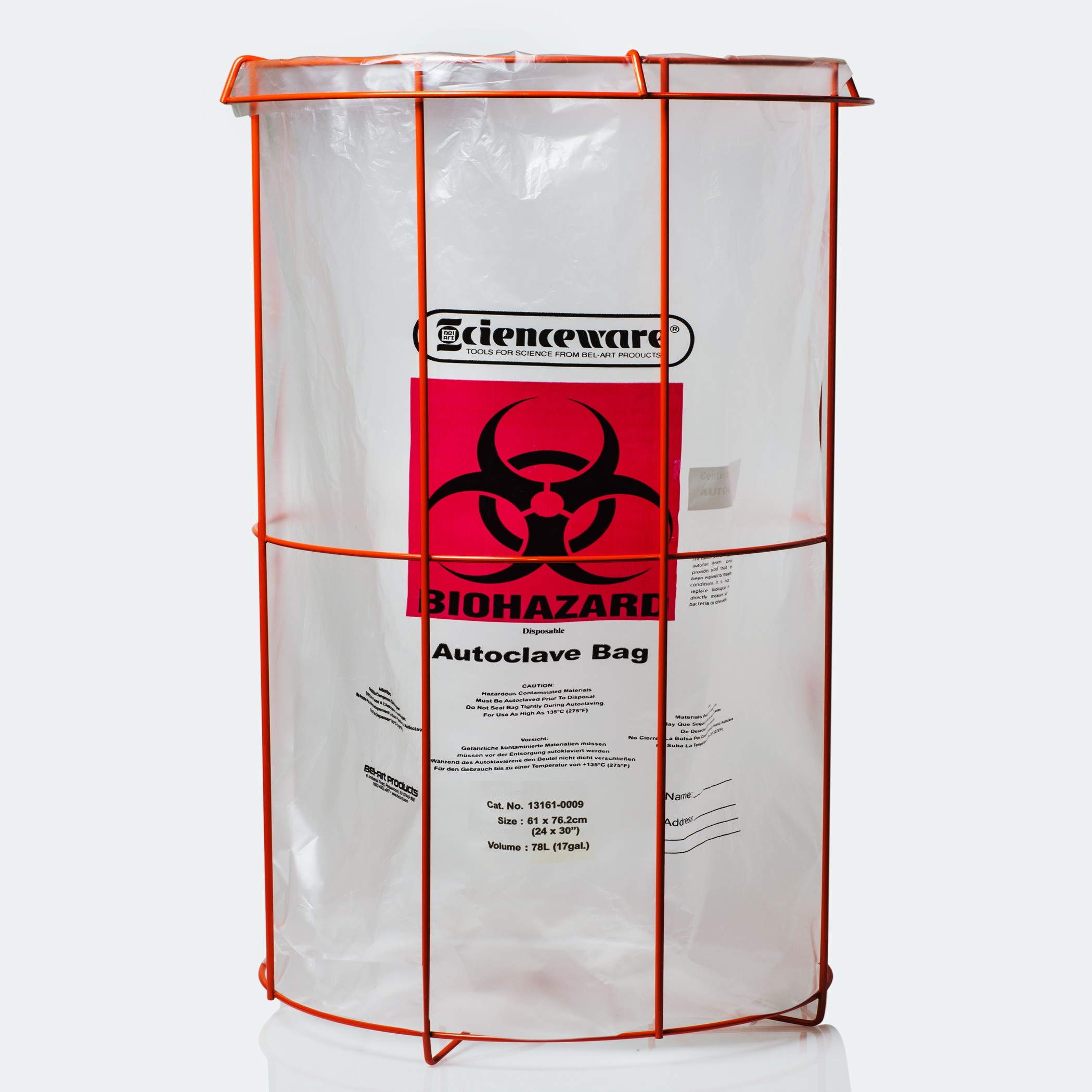 Safely and securely store a biohazard bag on the stainless steel wire frame of the Clavies® Biohazard Bag Holder. The frame is attached to a durable polypropylene bottom which also serves as a containment tray in the event of bag leakage. The safety orange color of the tray allows for quick and easy identification as a biohazard containment system. Autoclavable at 250°F (121°C) to maintain sterility. The small bag holder is intended for benchtop use.