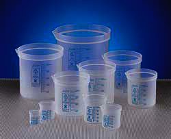These nongraduated beakers feature flared rims and spouts for quick, easy pouring when large volumes are handled. Made of polypropylene, they offer good chemical resistance and are steam autoclavable at 250°F (121°C).