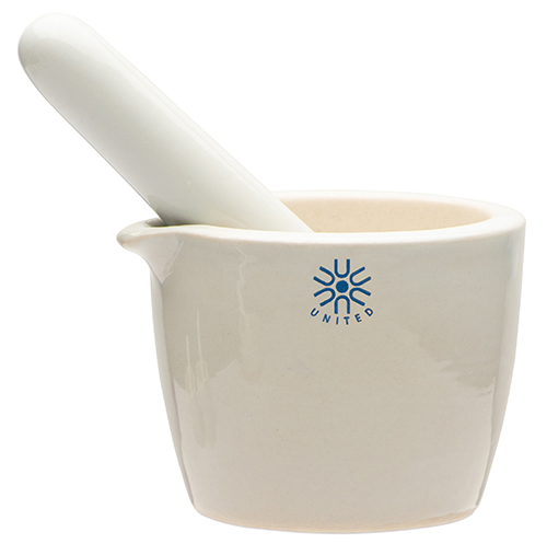 United Scientific Mortar & Pestles are made of porcelain. These deep form mortars are glazed on the outside (except for bottom) and unglazed inside. The pestles are glazed to grinding surface. Click the individual products below for individual specifications.