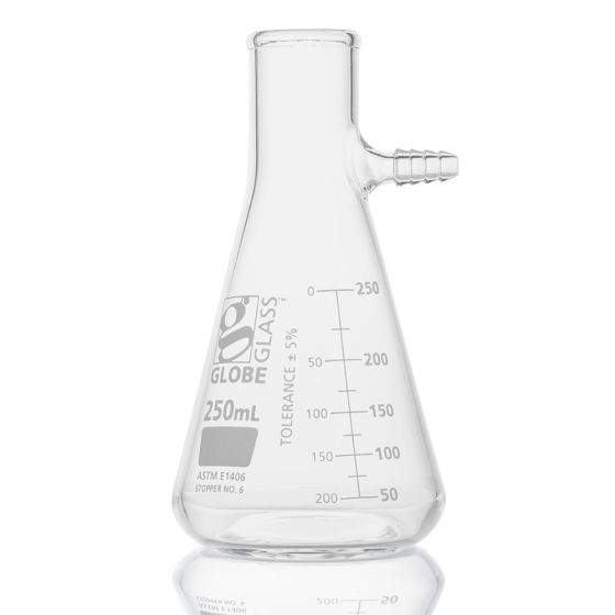 Globe Glass™ filter flasks meet ASTM E1406 specifications. Thick, heavy-duty walls provide the mechanical strength necessary for filtering operations. Flasks have side tubulation for connection to 7mm-8mm flexible tubing. Globe Glass filter flasks are designed with reinforced, beaded rims for strength and resistance to chipping.
