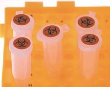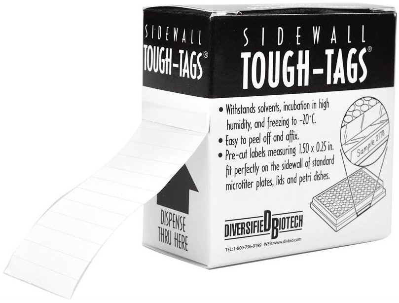 Tough-TagsŪ are precut, peel-off labels which accept any marking instrument and are perfectly sized to fit microcentrifuge tubes and other containers in the laboratory. Tubes with Tough-TagsŪ wrapped around them will still slide easily in and out of rotors without binding because the labels are thin and the adhesive does not migrate from behind the label even after boiling and autoclaving.