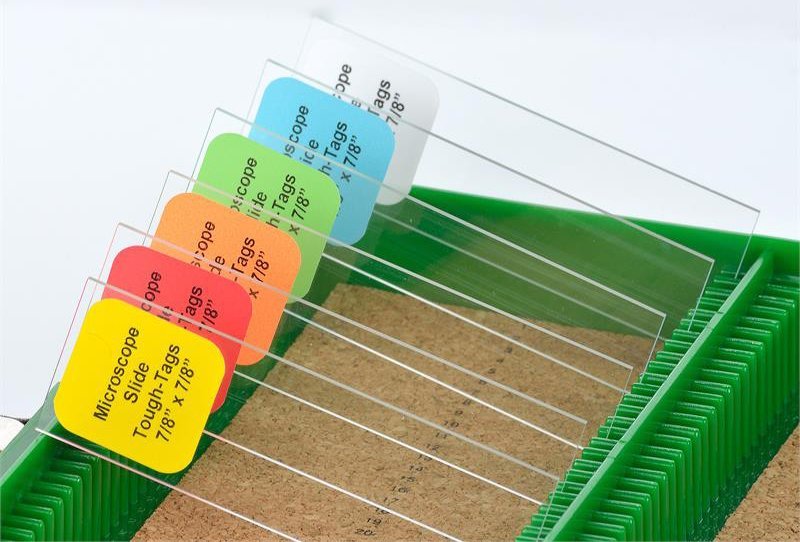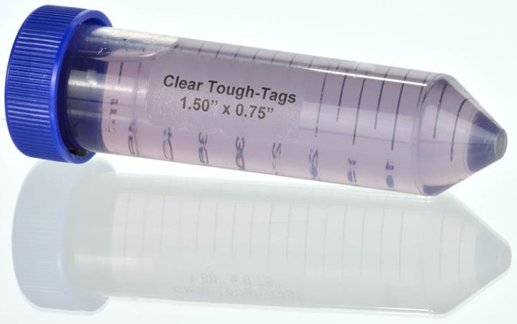 Tough-TagsŪ are precut, peel-off labels which accept any marking instrument and are perfectly sized to fit microcentrifuge tubes and other containers in the laboratory. Tubes with Tough-TagsŪ wrapped around them will still slide easily in and out of rotors without binding because the labels are thin and the adhesive does not migrate from behind the label even after boiling and autoclaving.