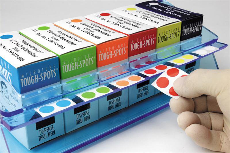 Color-coded Dual Tough-TagsŪ are available in five colors. A set consists of one 7/16" spot (11.1mm) and one 1-1/4" x 9/16" rectangular label (31.8 x 14.3mm). Supplied 500 sets per roll