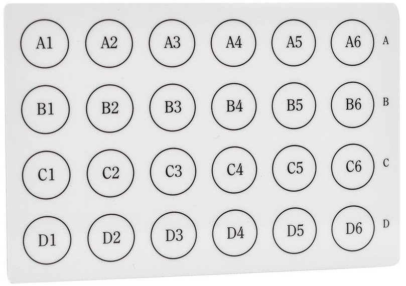 Permanently label mutliple microplates with clear Well Orienter Stickers. Each well is clearly marked with its corresponding row number and column letter for easy cross-referencing. The paper backing is scored in the middle allowing for easy aligning on the underside of the plate.