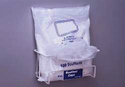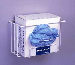 The Shoe Cover Dispenser Rack allows for quick access to shoe covers. The wall-mounted rack holds bagged, boxed, or pleated covers. Sold individually.