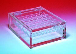 Specifically designed for safe storage, and angled for easy viewing of contents. The back of this clear acrylic 100-place box slides open for easy insertion of gel ice packs. 10-5/8 x 8-5/8 x 3-1/2.