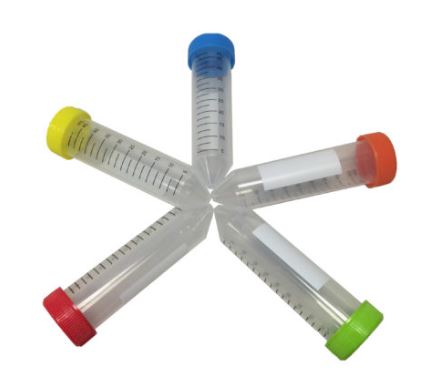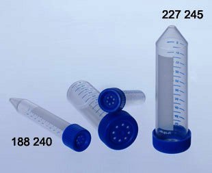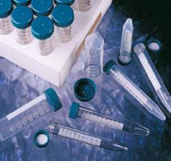 These centrifuge tubes are also useful for collecting and transporting biological specimens. Leakproof characteristics are ensured by a flat top plastic screw cap with an inner sealing lip. Tubes are made of translucent polypropylene or optically clear polystyrene with molded graduations from 2.5 to 50 ml. Polypropylene tubes can be autoclaved and will resist temperatures up to 121 °C; they will also resist acids, solvents and alkalies at room temperature.