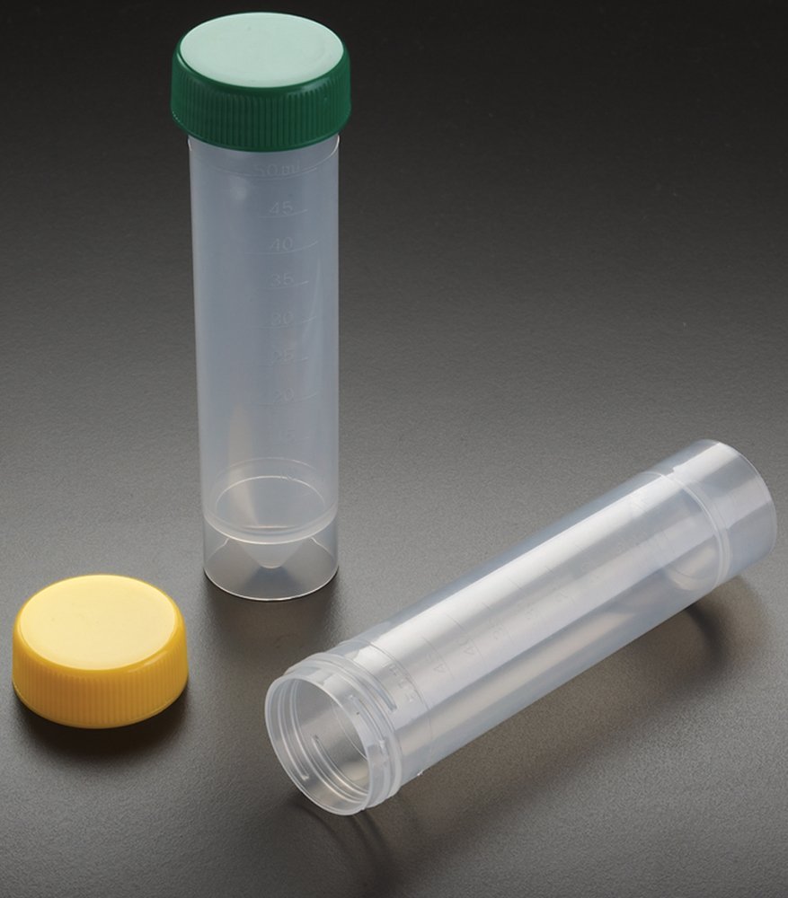 Conical bottom tubes with self-standing base graduated from 10 to 50 ml respectively in 5 ml increments. Chemically resistant and shatterproof, they are supplied with a leakproof screw cap, particularly important when transporting hazardous material. Ideal for transport and storage of urine, sputum and most liquids or particulate samples. Molded-in graduations make them easy to read. Functional temperature range: -90 °C to +121 °C.