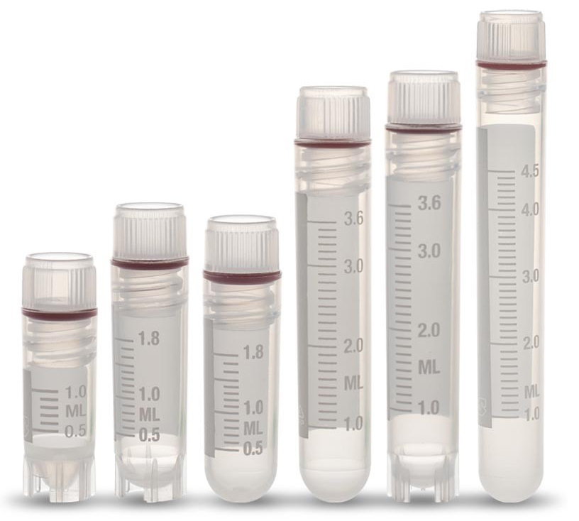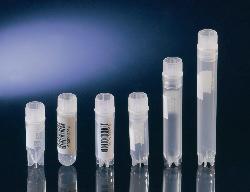 Specially formulated polypropylene vials that are designed for storing biological material, human or animal cells, at temperatures as low as -196 °C (but should be used only in the gas phase of liquid nitrogen). A silicone washer between cap and vial ensures a positive leakproof seal at all temperatures. A 1 1/4 turn of the cap is sufficient to seal the vial. Closure and vials are both manufactured of polypropylene with the same coefficient of expansion, ensuring an equally secure seal both at room temperature and at low cryogenic temperatures. Tubes have a white marking area, can be color coded with a CAPINSERT (Series T312) and are compatible with most storage systems. Only the round bottom vials can be centrifuged, and up to 17,000g. Sterilized by gamma radiation and packaged in unique tamperproof, resealable, safety-lock bags of 100.