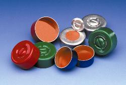 StandardCenter Disc Tear-Out Aluminum Seals are intended for filling or emptying vial contents with a syringe. The natural red rubber septa is faced with 2mil resin film.