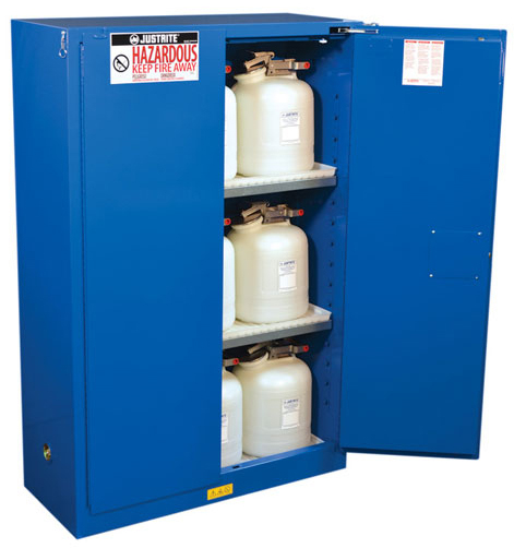 LabSource offers a full line of Justrite Hazardous Material Safety Cabinets. Justrite Cabinets have the same quality safety features as the cabinets for flammables. All models come with double-wall construction, dual vents, grounding wire connections, adjustable shelves, leakproof sills, three-point self-latching doors and leveling feet. Self-close door(s) shuts and latches automatically when a fusible link melts at 165°F (74ºC) under fire conditions. Unique, concealed self-closing mechanism offers obstruction-free access to contents.
