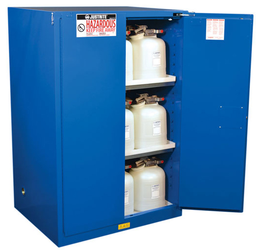 LabSource offers a full line of Justrite Hazardous Material Safety Cabinets. Justrite Cabinets have the same quality safety features as the cabinets for flammables. All models come with double-wall construction, dual vents, grounding wire connections, adjustable shelves, leakproof sills, three-point self-latching doors and leveling feet. Self-close door(s) shuts and latches automatically when a fusible link melts at 165°F (74ºC) under fire conditions. Unique, concealed self-closing mechanism offers obstruction-free access to contents.