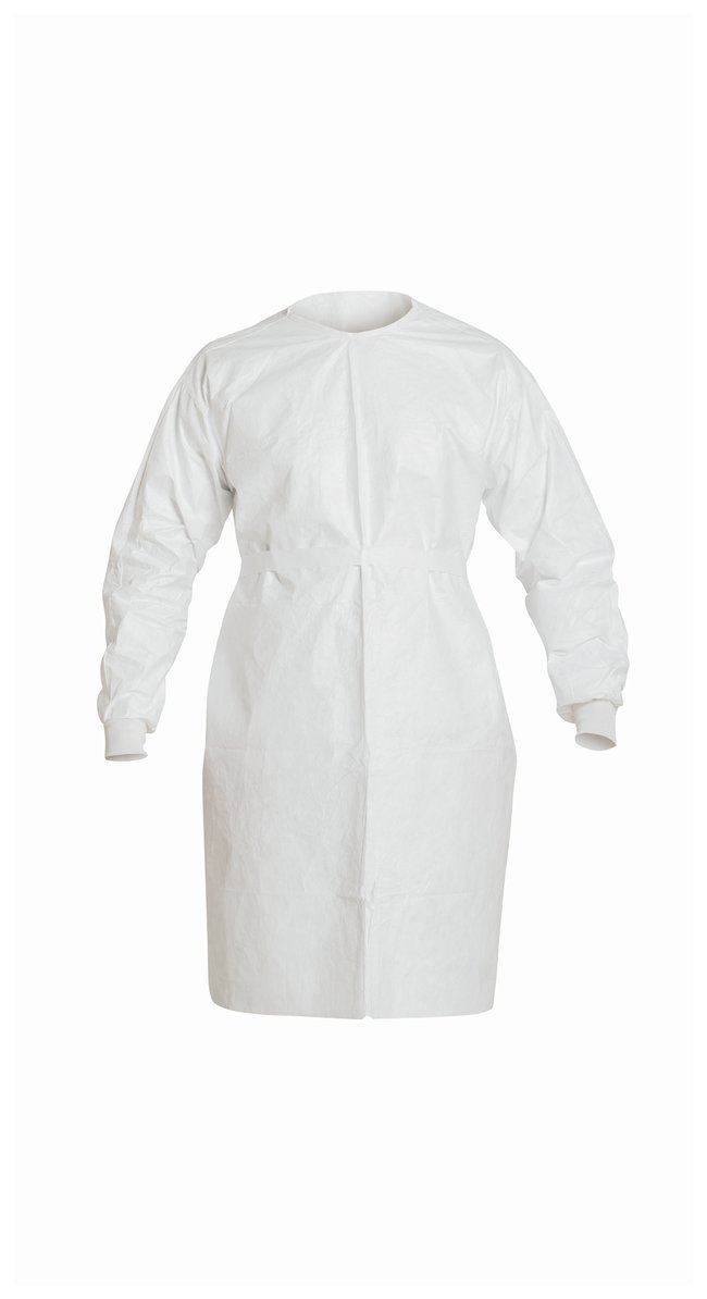 This gown is a latex free and lint free film coated gown for use in critical and low particulate clean environments. Static dissipative. Fabric is suitable for exposure to bloodborne pathogens, some hazardous liquids, and where liquid splash is a concern. Features include elastic wrists, elastic thumb loop, wrap-around neck ties, wrap-around waist ties and serged seam construction.