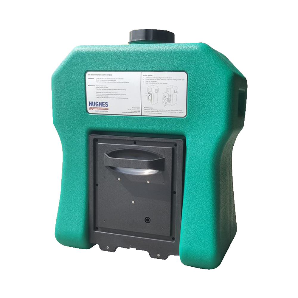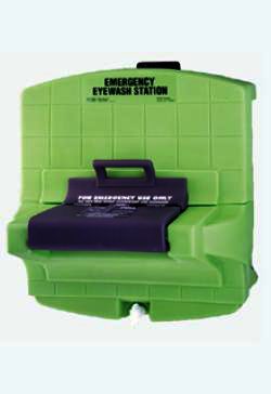 Station includes: Eyesaline® solution and an emergency eyewash sign. Constructed of tough, FDA approved, high impact polyethylene. Lockable fill-top cap reduces risk of tampering.