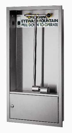 The stainless steel Cabinet-Mounted Station fits unobtrusively flush with a wall. The flow begins immediately when the swing arm is pulled down 90°, opening the 1/2¯ IPS stay-open valve. The unit has chrome-plated brass pipes and fittings. It is designed to mount between standard 16¯ wall studs and utilizes a 1/2¯ IPS water supply.Eyewash Stations feature soft-flow eyewash heads with protective covers and a flow control which ensures steady water supply between 30psi and 90psi.Eye/Face Wash Stations have large perforated sprayheads which bathe the eyes and the face. The slightly largerBarrier-Free models are designed to comply with all ADA (Americans with Disabilities Act) guidelines regarding reaches, clearances and operating procedures. All models meet ANSI Z358.1-2004 standards.