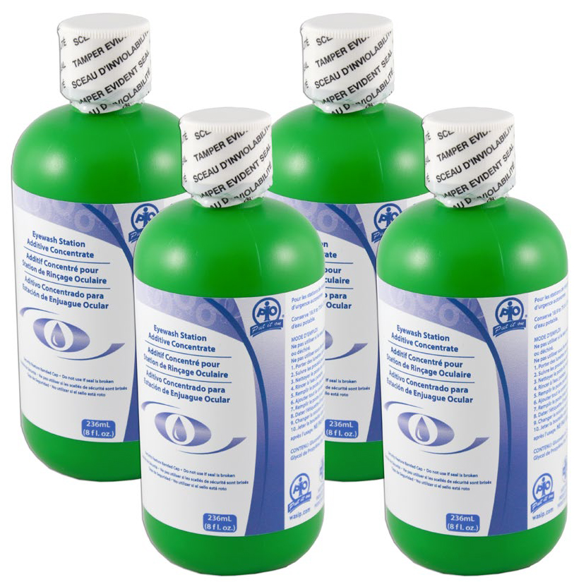 Eyewash additive preserves water in portable, self-contained eyewash stations to prevent bacterial growth. The treated water helps avoid additional damage to an already injured eye, while also extending the useful life of eyewash water. Simply fill a clean eyewash station with potable water and add the additive solution. Each 8 oz bottle preserves from 5-20 gallons of water and maintains water quality for up to 120 days. Treated water reduces the frequency of water changes, minimizing the maintenance required to stay compliant (ANSI Z358.1-2014, Section 5.5.3 recommends weekly visual checks for flushing fluid). Tamper-evident seal offers extra security. Sold in packs of 4, 8-oz bottles.