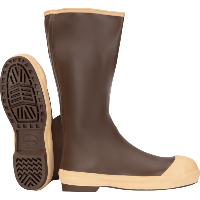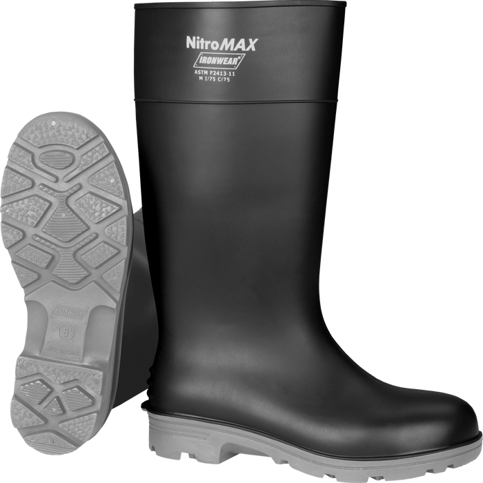 The NitroMax 15" black boots feature a durable PVC/Nitrile blend construction, offering superior waterproof protection and safety with an integrated steel toe cap. The one-piece design ensures no weak points or seams, while providing easy wear over socks or feet. The robust treaded sole delivers excellent slip resistance, making these boots ideal for demanding work environments.