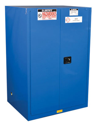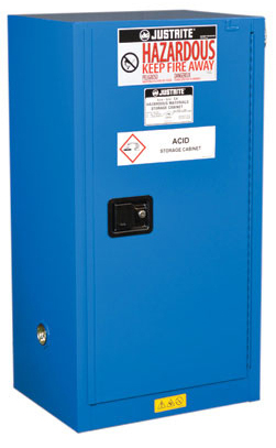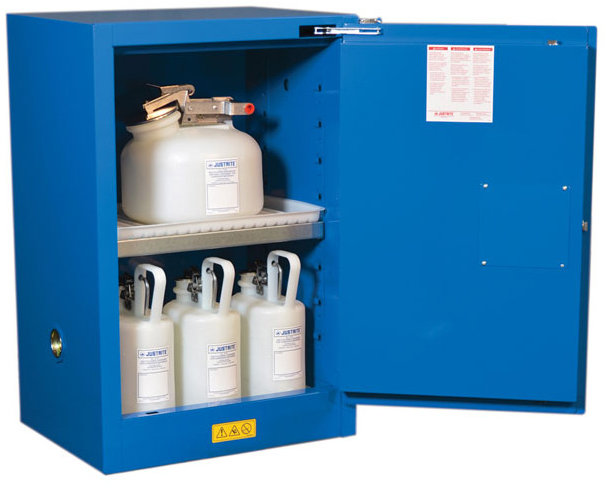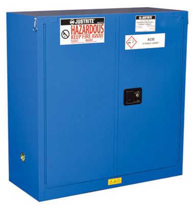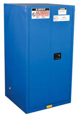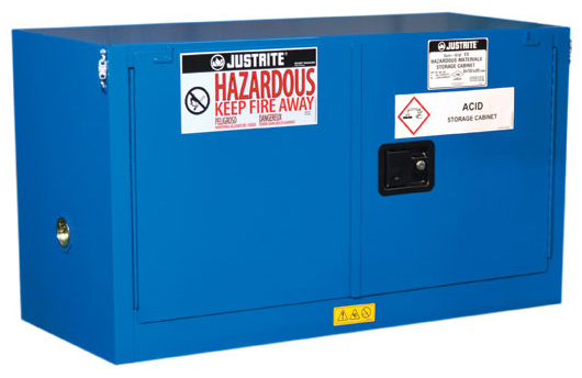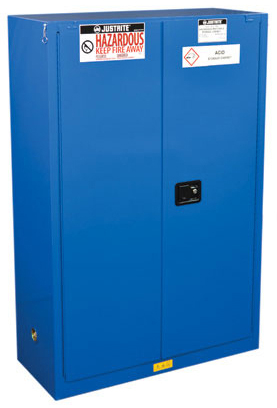 LabSource offers a full line of Justrite Hazardous Material Safety Cabinets. Justrite Cabinets have the same quality safety features as the cabinets for flammables. All models come with double-wall construction, dual vents, grounding wire connections, adjustable shelves, leakproof sills, three-point self-latching doors and leveling feet. Self-close door(s) shuts and latches automatically when a fusible link melts at 165°F (74ºC) under fire conditions. Unique, concealed self-closing mechanism offers obstruction-free access to contents.