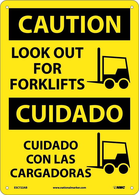 Ensure that everyone exercises caution in areas where there may be a forklift. This bilingual sign uses forklift graphics to emphasize the message further.