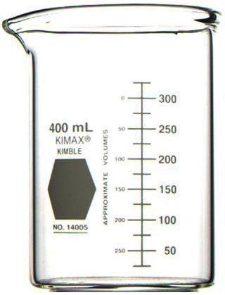 Kimax® beaker has a thick uniform wall throughout and extra wall thickness built into the evenly tooled top rim. Heavy construction is intended to prolong life expectancy with harder than normal usage (i.e. mechanical shock). Not recommended for use on hot plates where significant thermal gradients exist due to lack of agitation of contents or absence of a temperature control. All sizes have a durable matte-finish marking area and a white graduated scale.