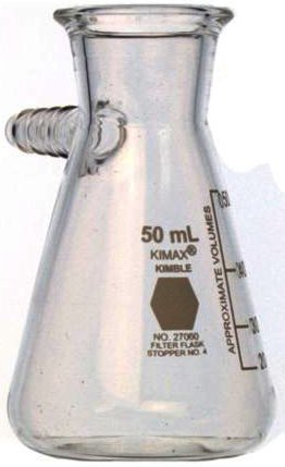 KIMAX® flask with side tubulation. Flasks are designed to take 1 atmosphere of vacuum or 29" of mercury. Sizes 25mL through 500mL have side hose connection designed to accept 5/16¯ I.D. flexible tubing. Sizes 1000mL and larger accept 3/8¯ I.D. tubing. Made with a heavier wall than a standard Erlenmeyer flask.