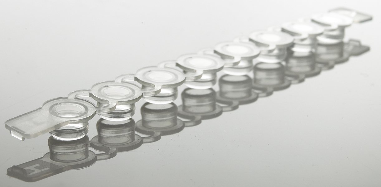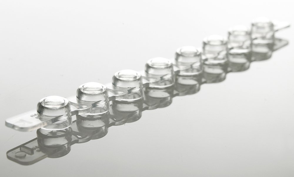 Strips of sealing caps, available in 8 strips, either domed or flat optical caps