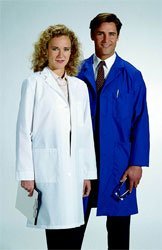 Tailored to fit both men and women comfortably. Full-length lab coat, with buttons, features three large, reinforced pockets. Slits in side seams allow access to pants pockets without unbuttoning coat. Made of 65% polyester and 35% cotton poplin fabric, with stain-release finish for maximum wear and minimal care. Length: 40 (102cm). Color: White.