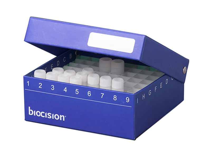 The Azenta Trucool hinge cryo boxes feature 81 slots for cryogenic tubes. It has a patented hinged lid offering convenience and archival integrity ensuring markings and vials remain in sync. The lid is fastened to the base and easy to open and close even when it's frozen.