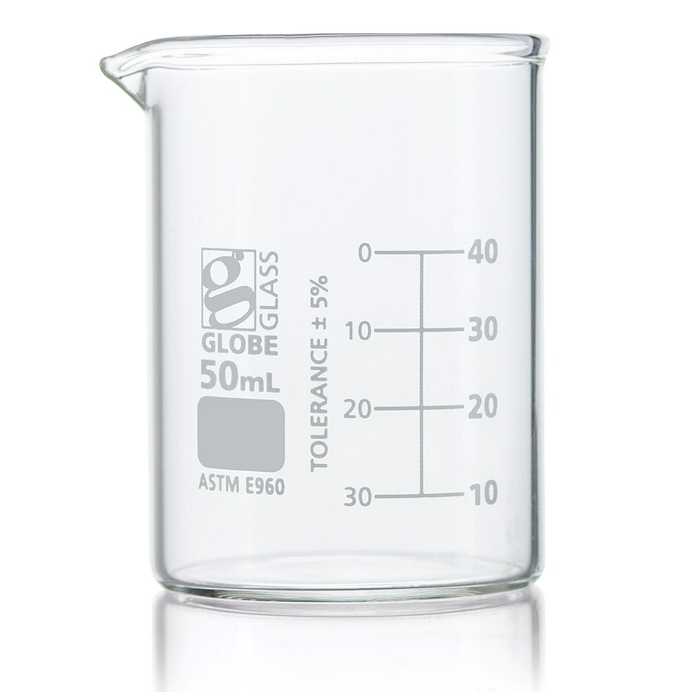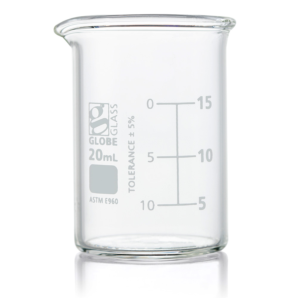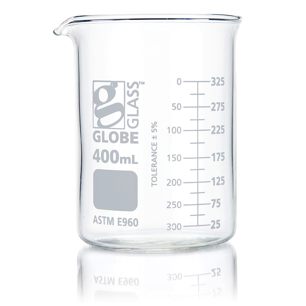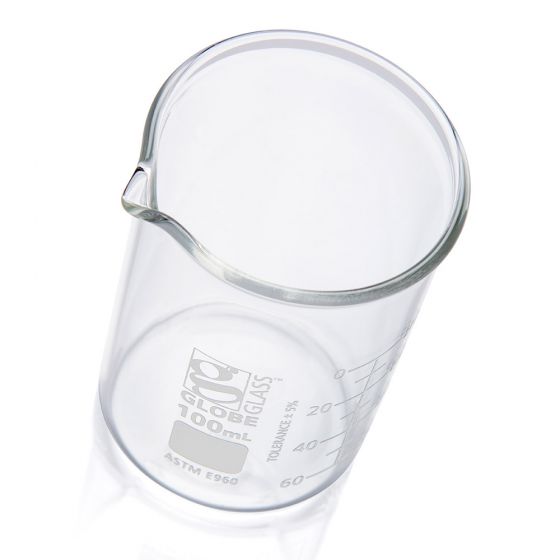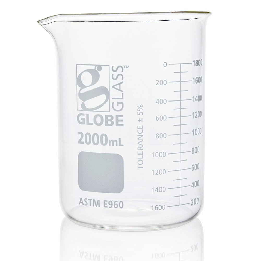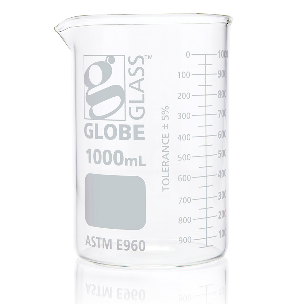 Globe Glass™ beakers are made with uniform wall thickness, flat bottoms, and low expansion 3.3 Borosilicate beaker glass making them a strong and durable choice with excellent resistance to thermal shock.  The lab beakers have beaded rims and formed spouts to facilitate accurate and steady pouring of liquids.  Globe Glass low form Griffin style graduated beakers are available in sizes from 10mL to 4000mL.
