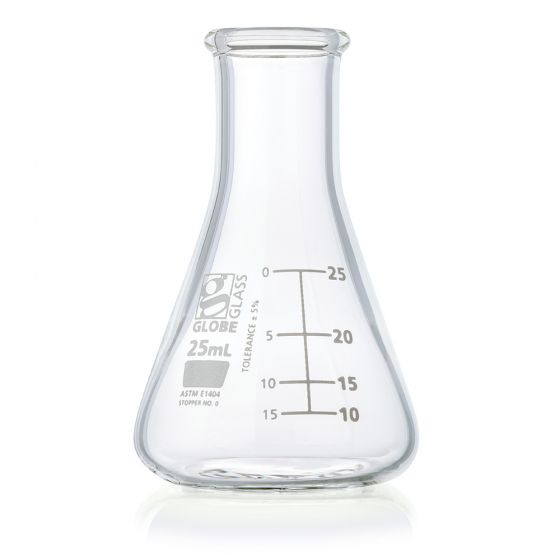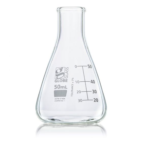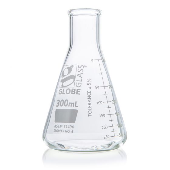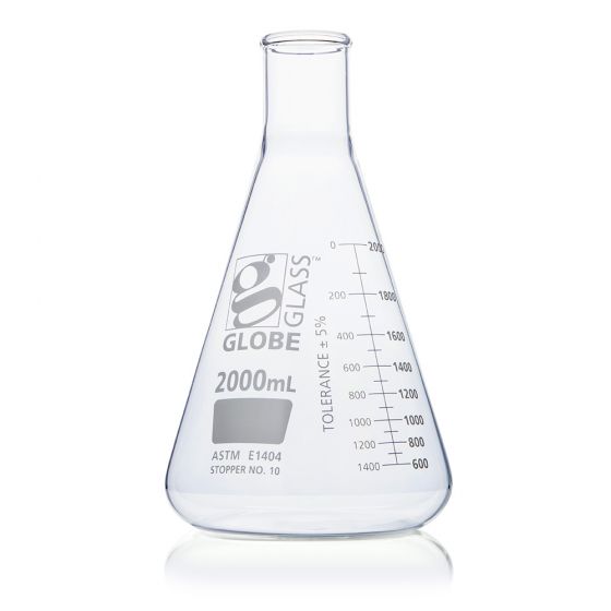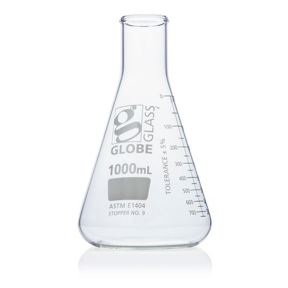 Globe Glass™ Erlenmeyer flasks meet ASTM E1404 specifications for narrow mouth, wide mouth and screw cap options and are available in a wide range of sizes.  Wide mouth conical flasks allow easy access to contents, while screw cap conical flasks include a GL45 cap with a PTFE liner for a leak resistant closure.  Globe Glass narrow and wide mouth Erlenmeyer flasks are designed with reinforced, beaded rims for strength and resistance to chipping.