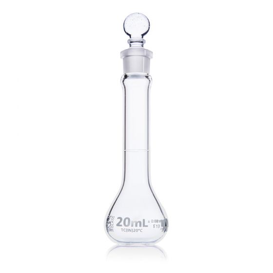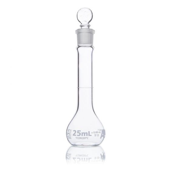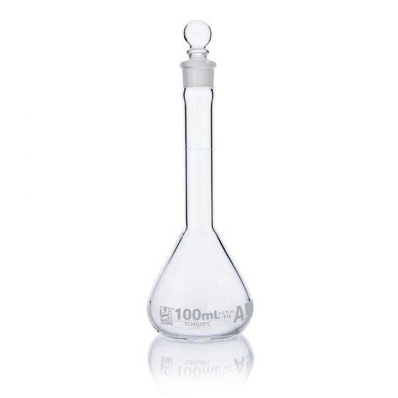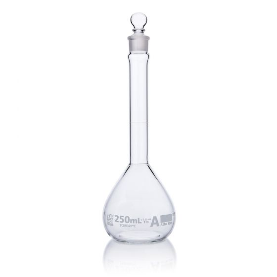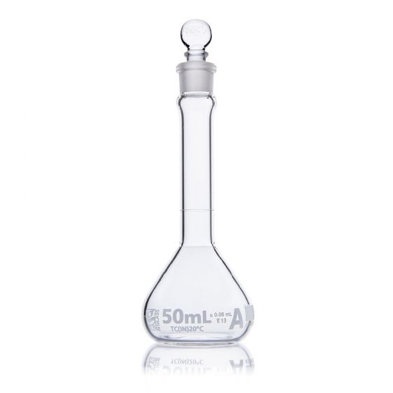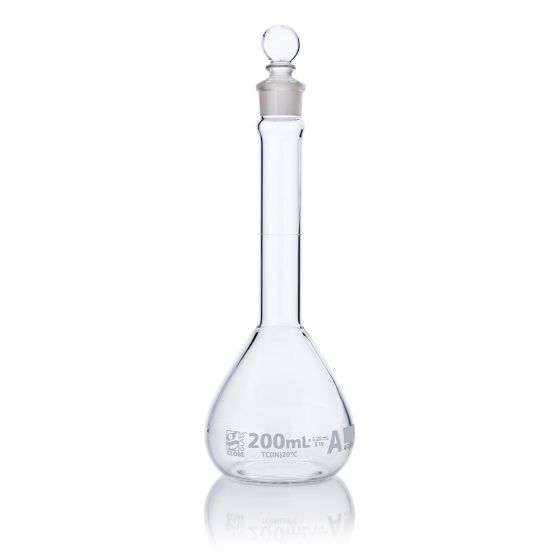 Globe Glass volumetric flasks are calibrated to meet ASTM tolerance specifications for precise measurement in solution preparation and dilution.  A diamond etched graduation line indicates the calibrated capacity of each measuring flask.  Wide mouth options are available for easier filling and mixing.  Globe Glass volumetric flasks are offered in sizes from 1mL to 2000mL and with Class A calibration tolerances.  Class A volumetric flasks include a batch calibration certificate.