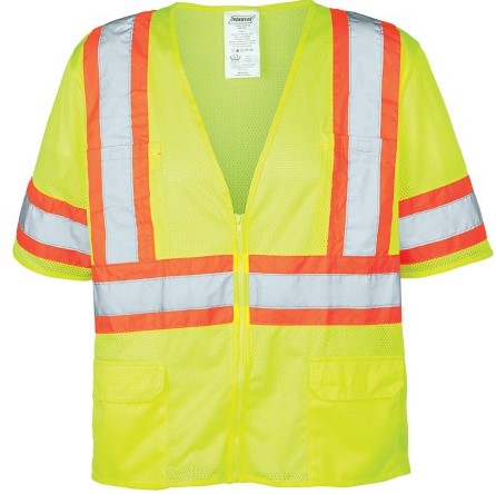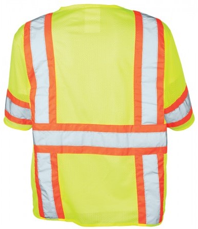 • Color – Lime with 2” Silver and 4” Orange Reflective Striping in a Suspender Pattern Over Top of Shoulders and a 360˚ Continuous Reflective Band Encircling the Torso