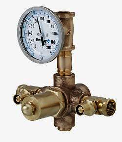 Thermostatic Mixing Valves combine hot and cold water to ensure that emergency eyewashes and showers have a comfortable water temperature. A liquid-filled thermostat allows for accurate temperature control to within ±3°F. Valves are preset at 85°F but can be adjusted between 65°F and 95°F. An easy-to-read dial thermometer clearly displays the temperature. Features include checkstops on inlets, a built-in cold water bypass and a positive shut-off of hot water supply to prevent scalding when cold water supply is lost. The8 gpm size accommodates up to three eyewashes or one eye/face wash. The36 gpm size is for use with one combination eyewash/shower or multiple eyewashes. The67 gpm size can be used with up to two combination eyewash/showers or multiple eyewashes. UPC and CUPC certified, CSA listed.