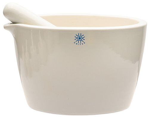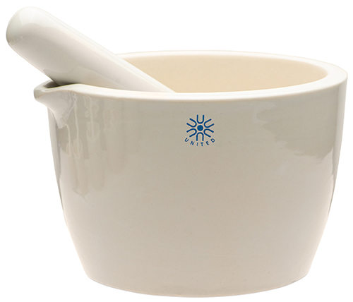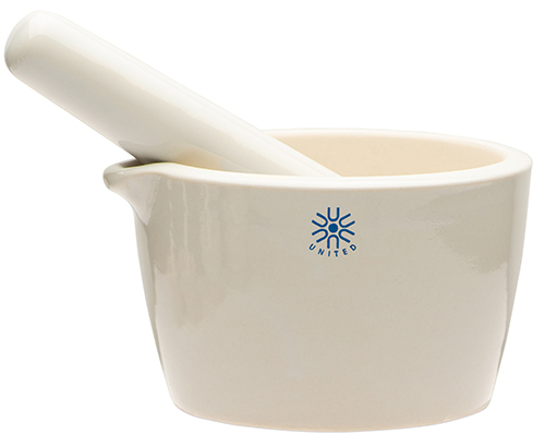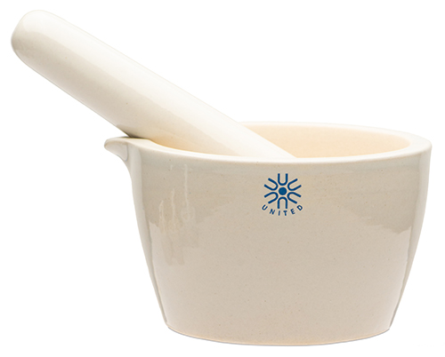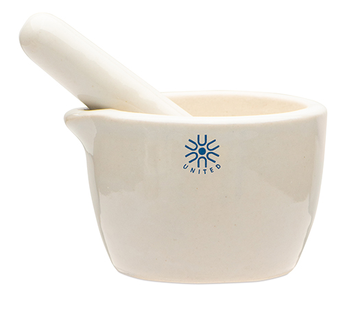 United Scientific Mortar & Pestles are made of porcelain.  These deep form mortars are glazed on the outside (except for bottom) and unglazed inside.  The pestles are glazed to grinding surface. Click the individual products below for individual specifications.